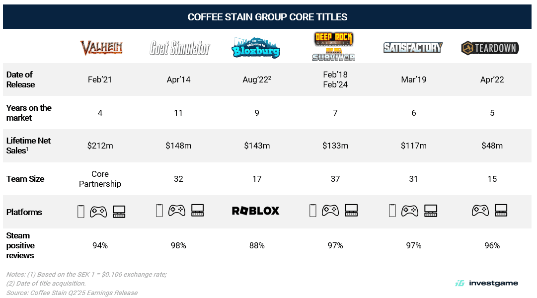 Coffee Stain was divested as part of Embracer Group’s restructuring program, which aimed to streamline the group and allow each division to focus on its respective strategy. The direct listing of Coffee Stain follows the Asmodee listing in Apr’25. Coffee Stain Group will focus on developing and expanding PC & Console indie and AA projects, prioritizing their six core IPs while selectively investing in new titles. The company’s 90% of revenue has been driven by 6 major franchises: Goat Simulator, Satisfactory, Deep Rock Galactic, Valheim, Teardown, and Welcome to Bloxburg.