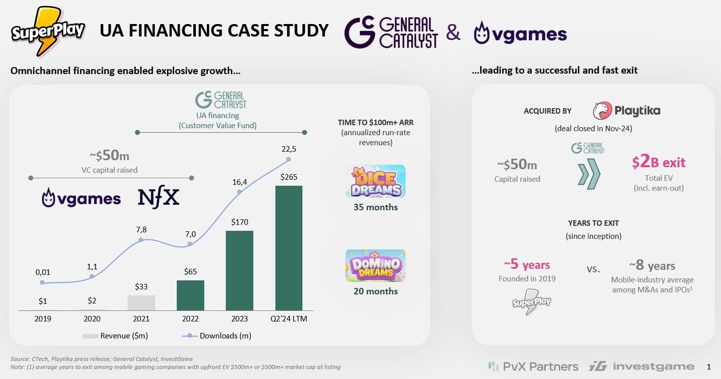 The model has already been validated through SuperPlay (read more in the InvestGame UA Financing report). In 2021, General Catalyst provided growth financing to the studio via its Customer Value Fund, supporting growth without equity dilution. SuperPlay’s revenue has seen tremendous growth, achieving $100m+ ARR in less than 3 years.