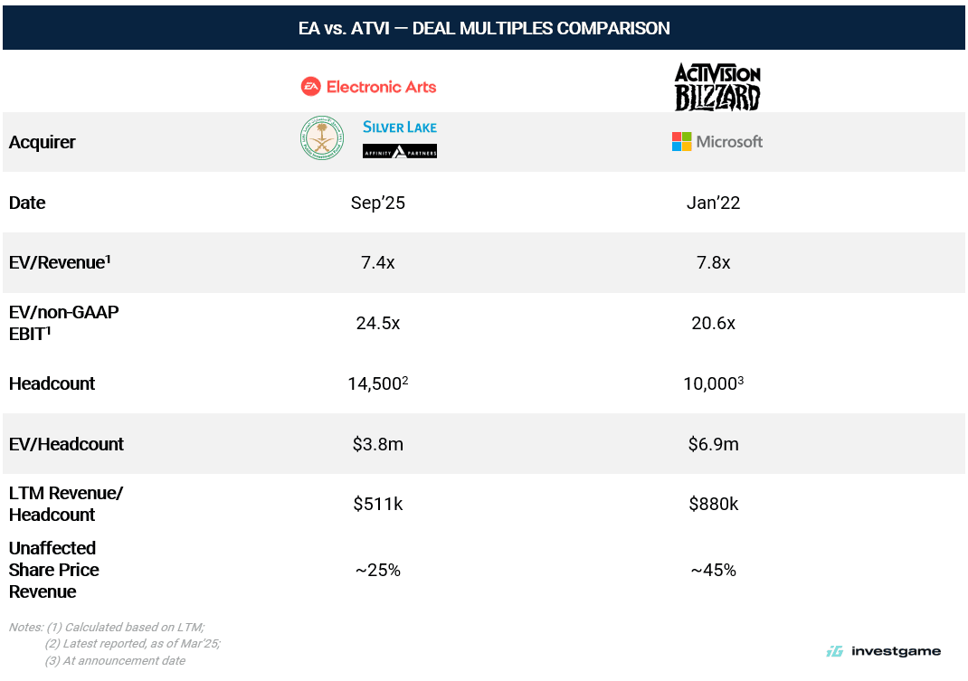 The $210/share offer, representing a 25% premium, re-rates EA to valuation multiples that public markets had not rewarded. Despite the company’s flat growth profile, institutional and sovereign investors bid for strong double-digit valuation multiples (21.2x EV/LTM EBITDA) for stable, cash-generative franchises.