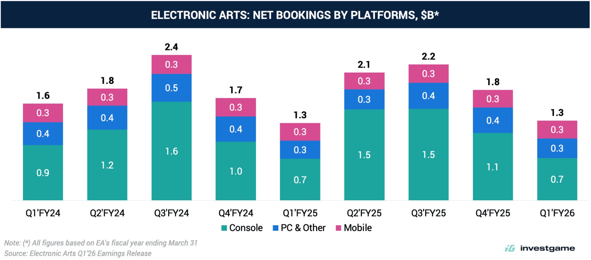 - EA SPORTS FC — The franchise is the cornerstone, with approximately 85% of all net bookings from full-game copies sold in the last twelve months coming from EA SPORTS FC. Despite losing the FIFA license, demand has remained resilient.