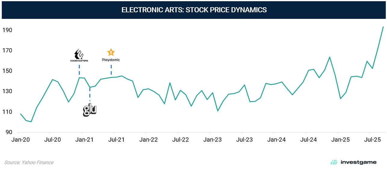 Today, EA finds itself in a different position. While it remains one of the industry’s largest publishers, its growth profile has shifted. Revenues remain flat, sustained primarily by its sports franchises, while other segments deliver uneven results. The company has invested heavily in M&A — $5B since 2020 across Codemasters, Glu Mobile, and Playdemic — but these deals have not become new growth engines for EA. Within public markets, that pattern has recast EA: no longer viewed as a high-growth innovator, but increasingly as a cash-flow utility — valued for predictable margins, yet discounted for its lack of expansion.