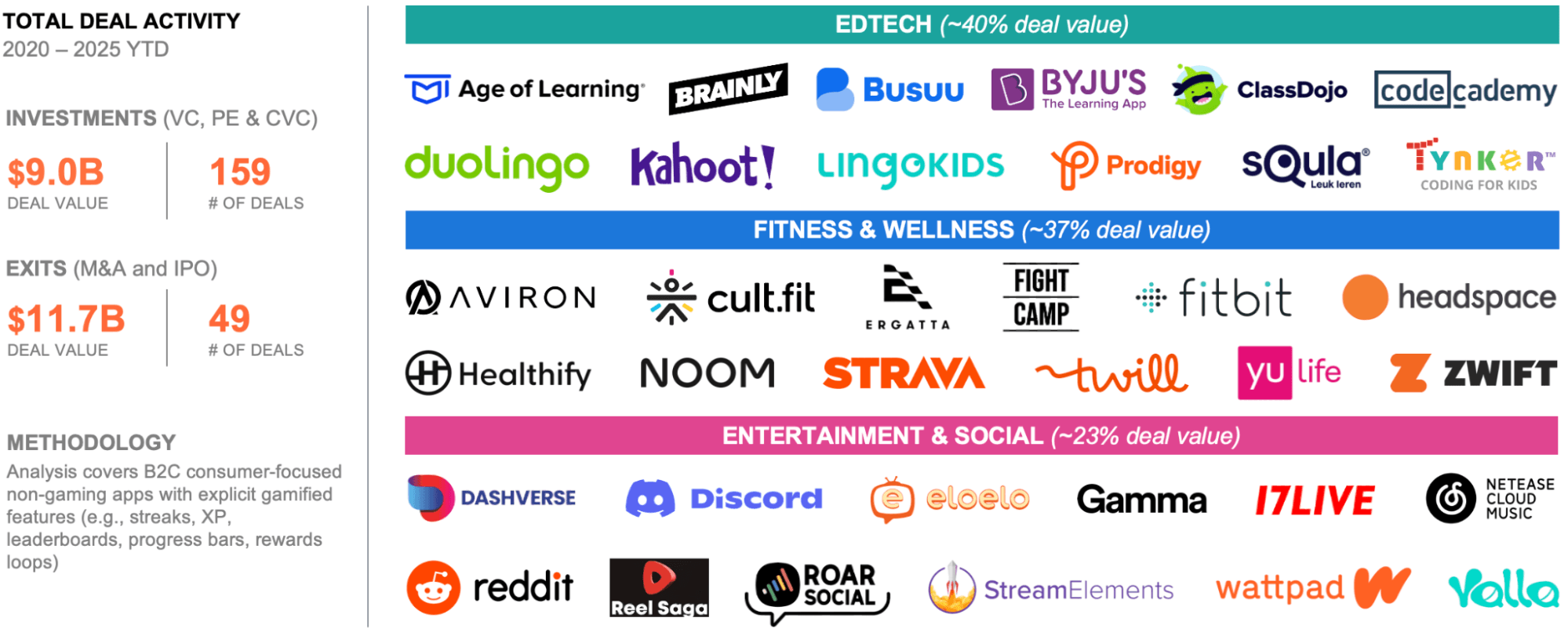 Methodology: Analysis covers B2C consumer-focused non-gaming apps with explicit gamified features (e.g., streaks, XP, leaderboards, progress bars, rewards loops) in EdTech, Fitness & Wellness, and Entertainment & Social that received VC/CVC investments or completed M&A/IPO transactions between 2020 and 2025 YTD.