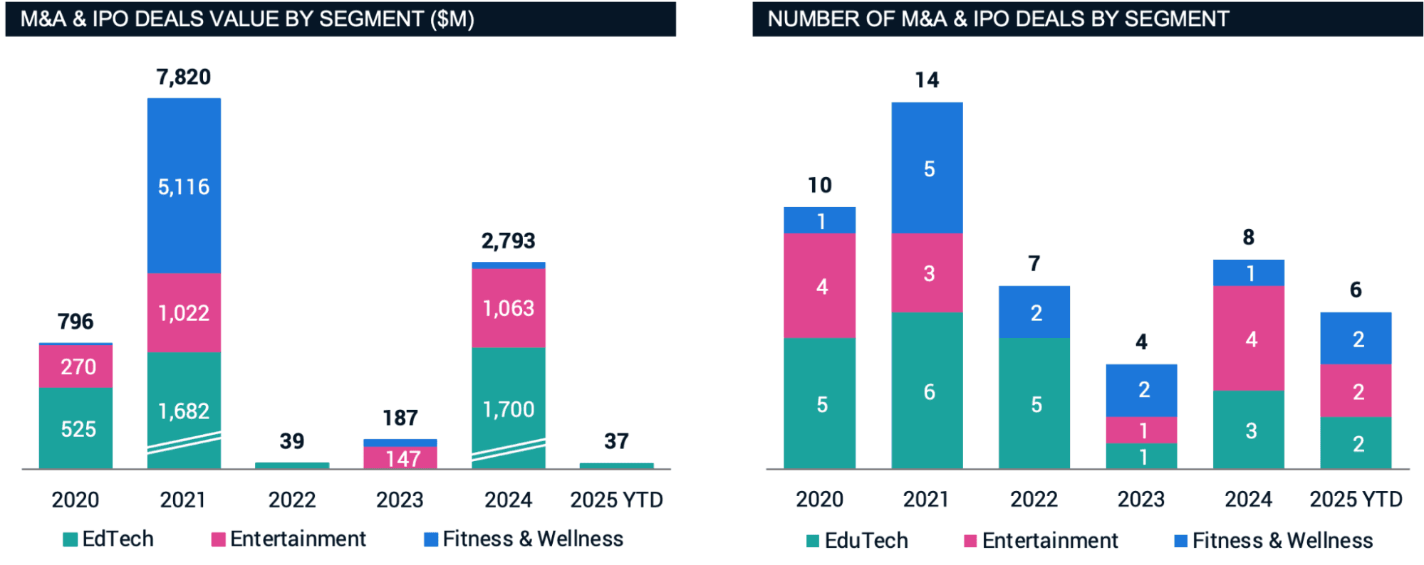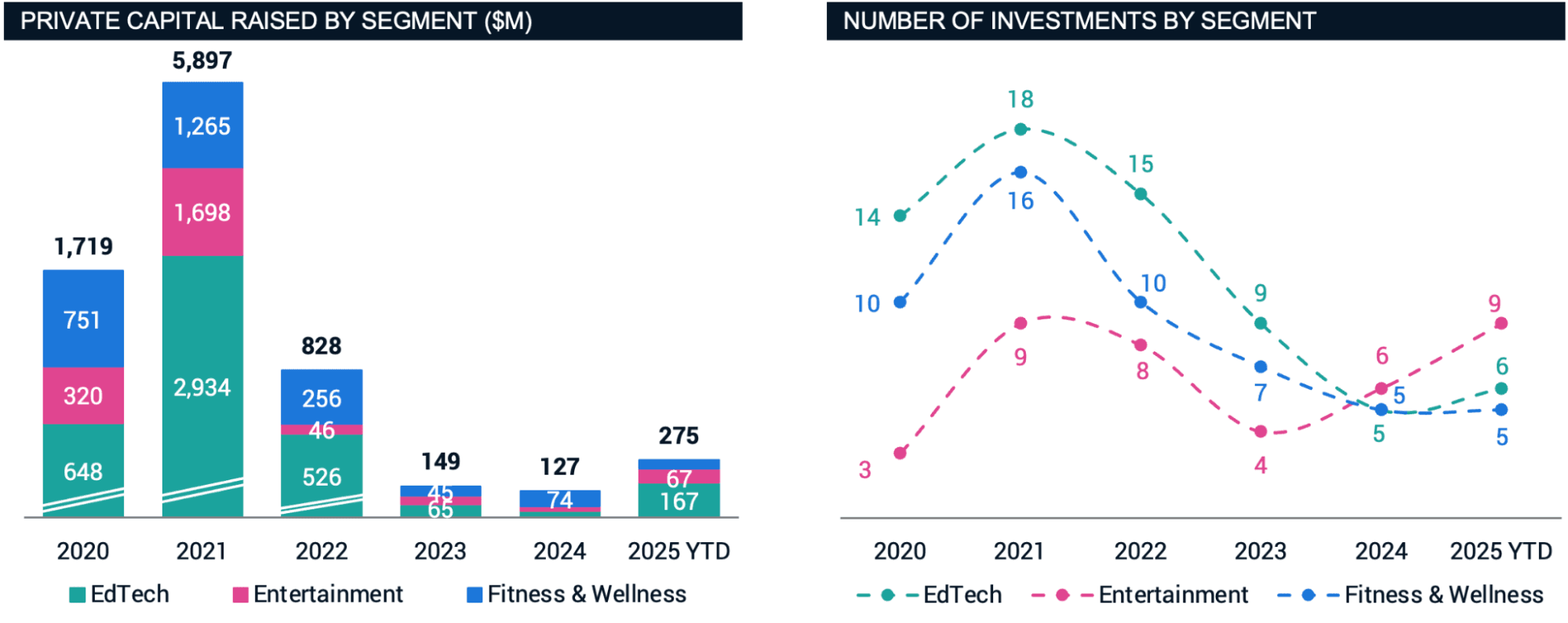 However, aggregate numbers obscure vertical dynamics. Each vertical—EdTech, Fitness & Wellness, Entertainment & Social—developed distinct characteristics, investor profiles, and monetization models. To understand where capital is concentrated and which mechanics attracted strategic exits, we examine each segment separately.
