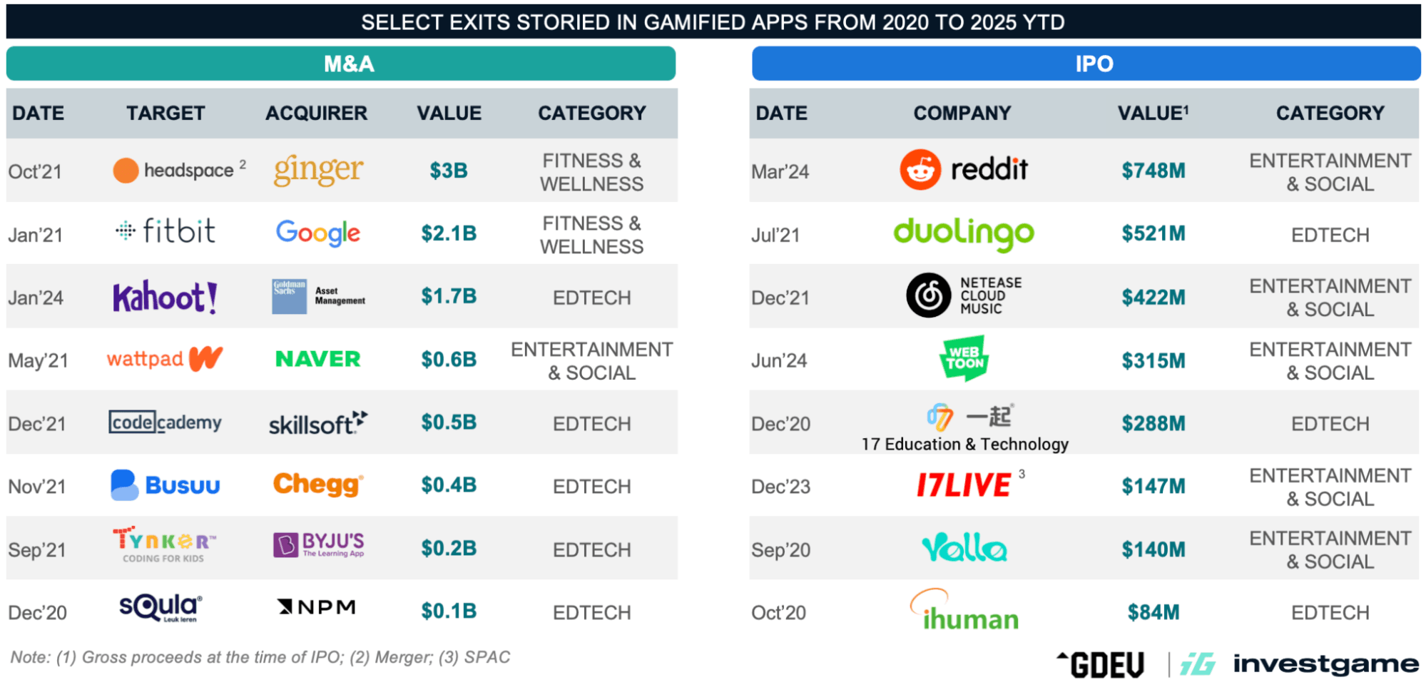 The InvestGame team decided to map the sector systematically. Our analysis reveals that since 2020, gamified consumer apps built on gaming progression mechanics have generated over $20.7B across 208 transactions, split among EdTech (~40%), Fitness & Wellness (~37%), and Entertainment & Social (23%). The shift is structural: while mobile gaming in-app purchase revenue stagnated over the past year, non-gaming consumer apps surged 24% YoY, surpassing games for the first time in H1’25 ($41B vs $40B, according to Sensor Tower). Retention systems designed for video games now drive measurable performance when applied to consumer apps with real-world outcomes. Gamification is no longer just a UX layer—it’s a growth engine that powers retention and monetization.