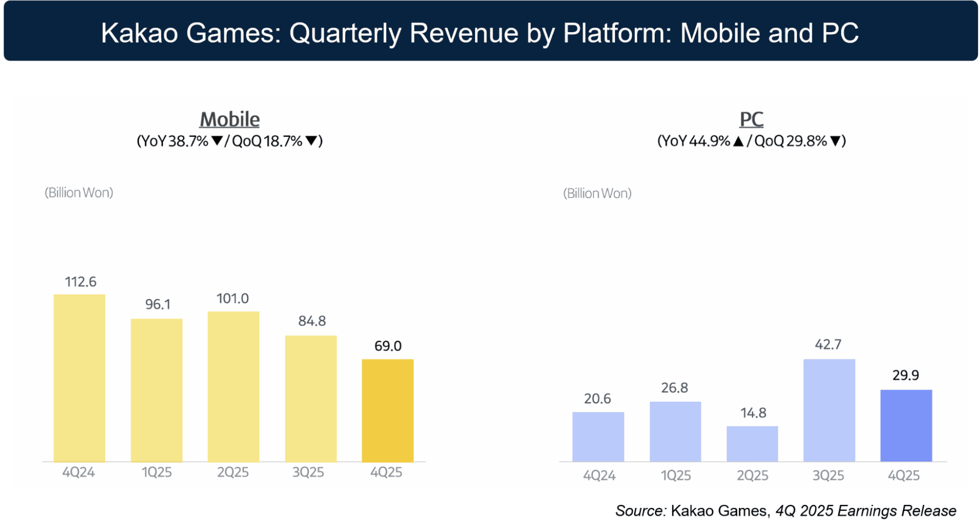 Q4’25 consolidated revenue reached ~$70m (KRW 98.9B), down 25.8% YoY and 22.4% QoQ from Q4’24 ~$98m (KRW 133.2B): mobile contracted 38.7% YoY on the absence of new title launches, partially offset by PC growth of 44.9% YoY driven by PUBG collaboration updates.
