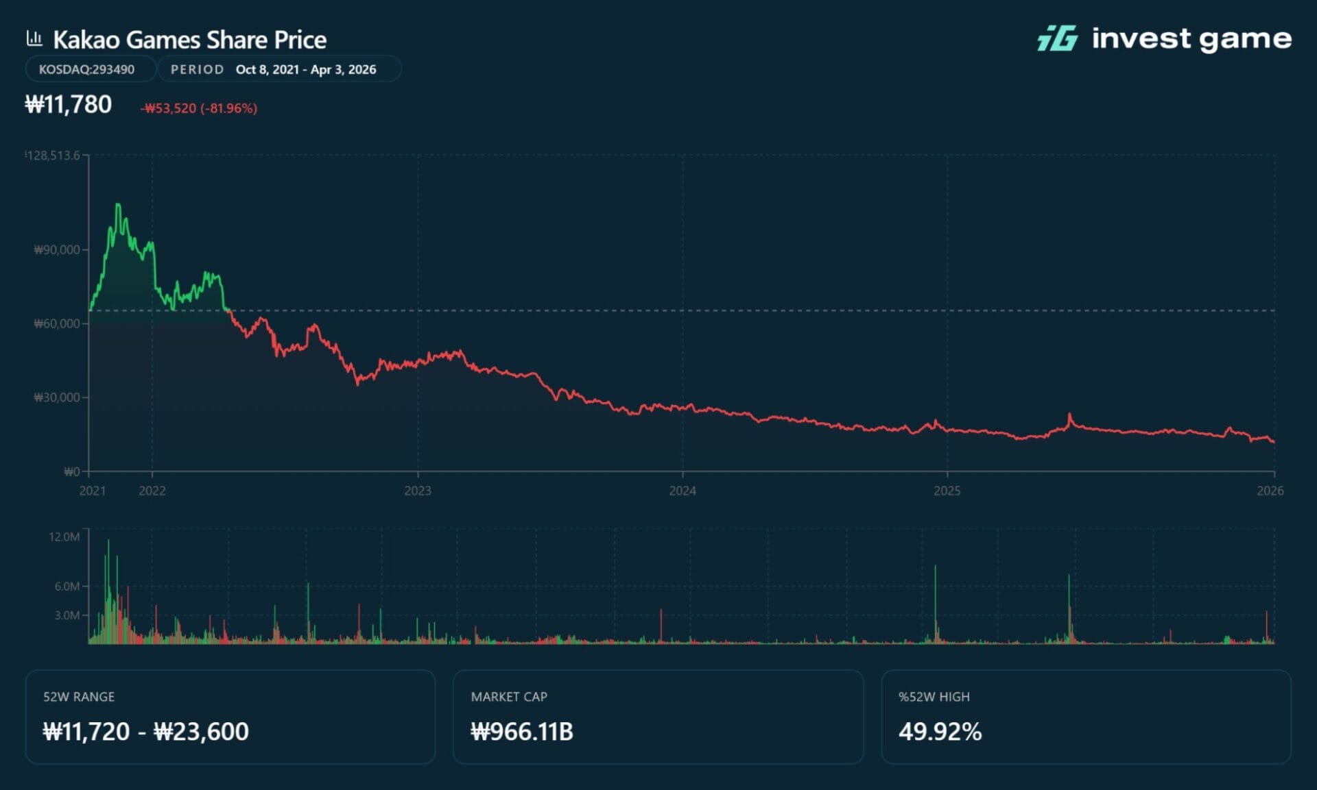 Kakao Games went public on KOSDAQ on Sep 10, 2020, at an offering price of KRW 24,000 per share, at the top of its indicative range following record-breaking book-building demand. The stock has declined ~82% from its all-time high, hitting KRW 11,780 as of Apr 3, 2026. At that price, the company’s market capitalisation stands at ~$639m (KRW 966B). The market’s initial response to the deal was cautious: the stock fell ~15% across four consecutive sessions following Mar 25, 2026, as investors flagged dilution risk from the 17.4 million new shares and the complexity of the convertible bond instruments. LY Corporation shares mirrored this downward trend, declining 4.6% over the same four-session period, but have since fully recovered to JPY 393 as of Apr 3, 2026.
