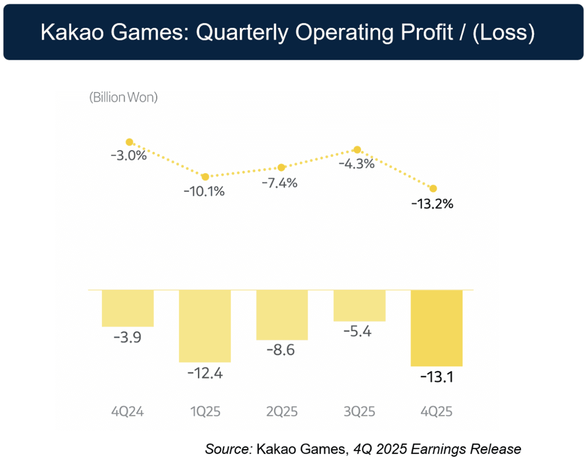 The company posted a Q4’25 operating loss of ~$9m (KRW 13.1B), widening from a Q4’24 ~$3m (KRW 3.9B) loss and extending a streak of five consecutive quarters of operating losses.