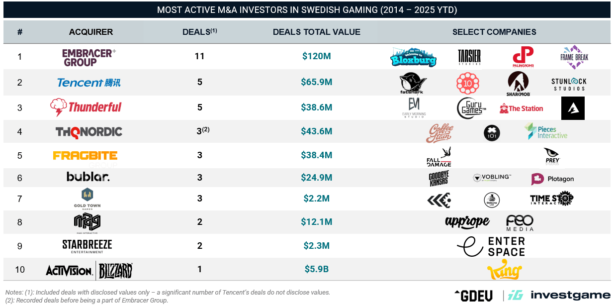 Three landmark exits — King ($5.9B), Mojang ($2.5B), and ESL ($1.05B) — account for 93% of Swedish gaming M&A value, all closing by 2022. Sweden hasn’t minted a billion-dollar exit since. But the track record speaks for itself: strategic acquirers who bet on Swedish talent have been rewarded handsomely. Microsoft’s Mojang purchase delivered a platform-defining franchise; Activision Blizzard’s King acquisition secured mobile’s most durable cash-flow engine; EA’s DICE investment yielded decades of Battlefield dominance – including Battlefield 6, the best-selling game of 2025; and Nexon’s full acquisition of Embark produced back-to-back hits in The Finals and ARC Raiders (Best Multiplayer at The Game Awards 2025). The pedigree is proven. Now a new generation is forming: Tencent’s $80m investment in Arrowhead at a $530m+ valuation, plus a wave of independent studios shipping viral indie breakouts and survival hits, suggest the next chapter of Swedish M&A will be written by strategic buyers who recognize that betting on Swedish execution continues to pay off.