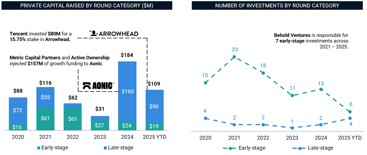 After a deep pullback in 2022–23, private capital returned in 2024 — but the pattern shifted. Late-stage rounds now dominate capital flows, concentrated around a handful of proven operators rather than broad early-stage deployment. Tencent invested $80m for a 15.75% stake in Arrowhead, implying a valuation above $500m for the studio behind Helldivers II. Metric Capital Partners and Active Ownershipinjected $157m of growth funding into Aonic. Early-stage deal count, meanwhile, dropped from 23 rounds in 2021 to 13 in 2024 and 6 in 2025 YTD — a normalization after the peak rather than a collapse.