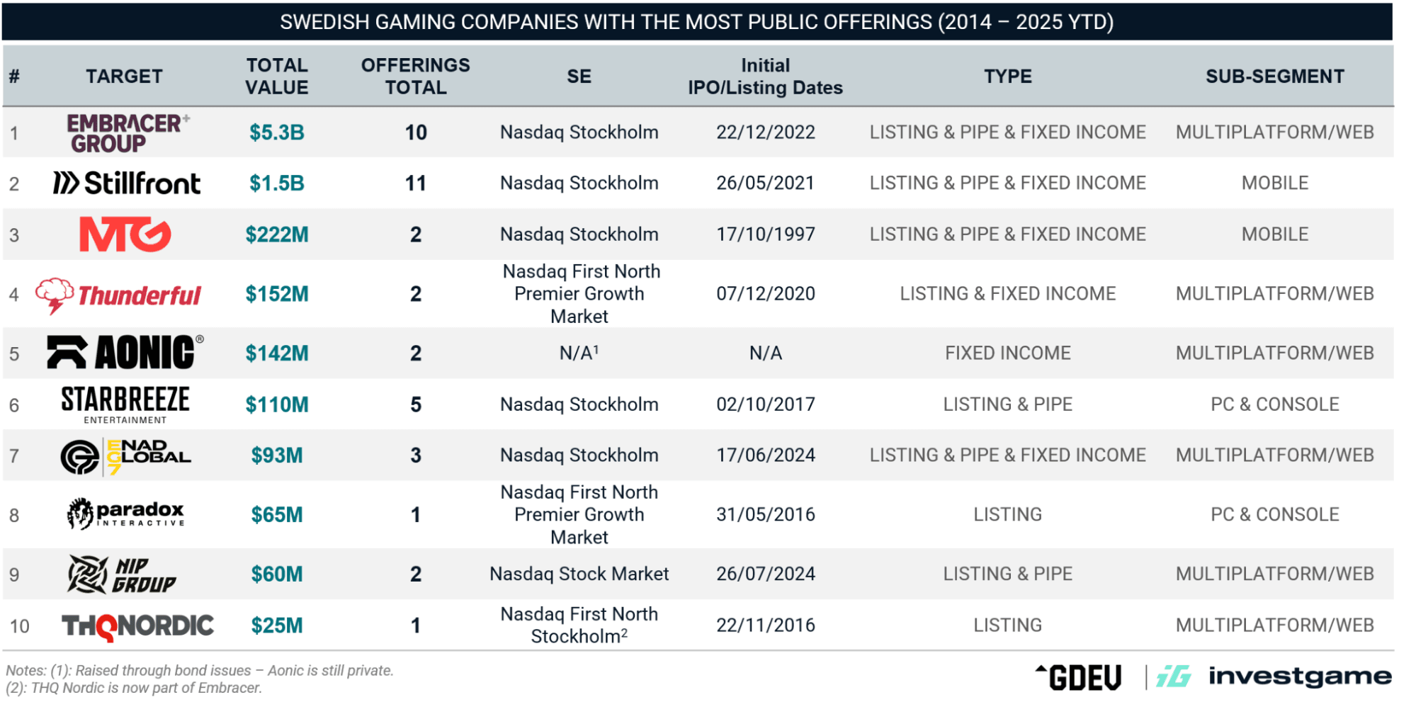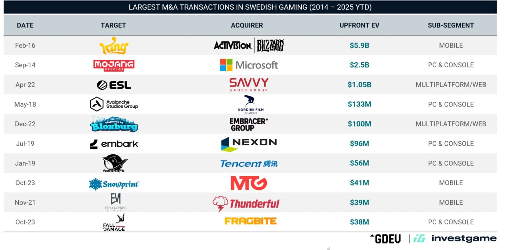 Sweden’s strength spans both sides of the gaming industry. In PC & Console, studios like Arrowhead, Embark Studios, Paradox (STO: PDX), MachineGames, and Coffee Stain Group (STO: COFFEE b) built global franchises through design excellence and engineering depth. In mobile, King’s $5.9B exit to Activision Blizzard validated Swedish operators at scale — and opened the door for holdings like Stillfront (STO: SF), MTG (STO: MTG), and Embracer (STO: EMBRAC B) to build substantial mobile portfolios through public-market-funded M&A. These consolidators became Europe’s most aggressive acquirers during the era of zero interest rates.